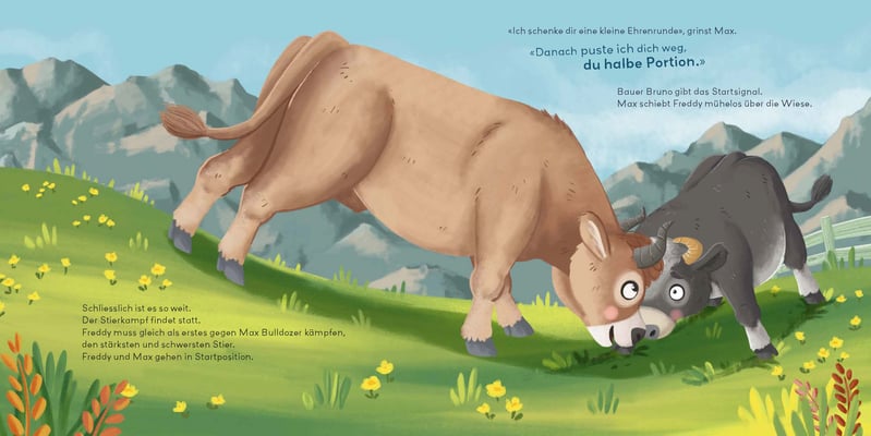 Dafür müsste er allerdings die anderen Jungstiere im Stierkampf besiegen, doch als rätisches Grauvieh ist er von Natur aus kleiner und schmächtiger als sie. Altstier Ringo Forte möchte ihn deshalb nicht einmal ins Training aufnehmen.