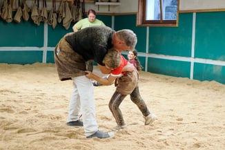Dort habe ich dann auch selbst geschwungen. Oder besser gesagt: ich wurde geschwungen. Lina (9 Jahre) warf mich problemlos 2 mal in Sekundenschnelle ins Sägmehl