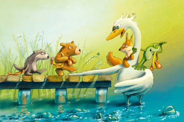 Nur der kleine Otter hat keinen Spass. Es geht ihm alles etwas zu schnell und dann hat er auch noch seinen Znüni vergessen. Aber die anderen Kinder lassen ihn nicht im Stich. Und als dann auf dem Heimweg ein Unglück passiert, kann der kleine Otter seine Schüchternheit überwinden und die Situation retten.